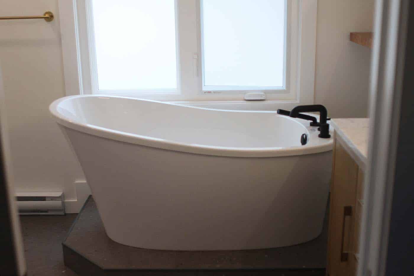 The renovation included full demolition of the existing bathroom and adjacent wall, reframing and moving the doorway, and reconfiguring all plumbing to accommodate the new layout. We relocated the tub, shower, vanity, and toilet; installed new flooring, drywall, and paint; added an exhaust fan and modern lighting; updated windows and trim; and finished with a fully tiled shower for durability and style.