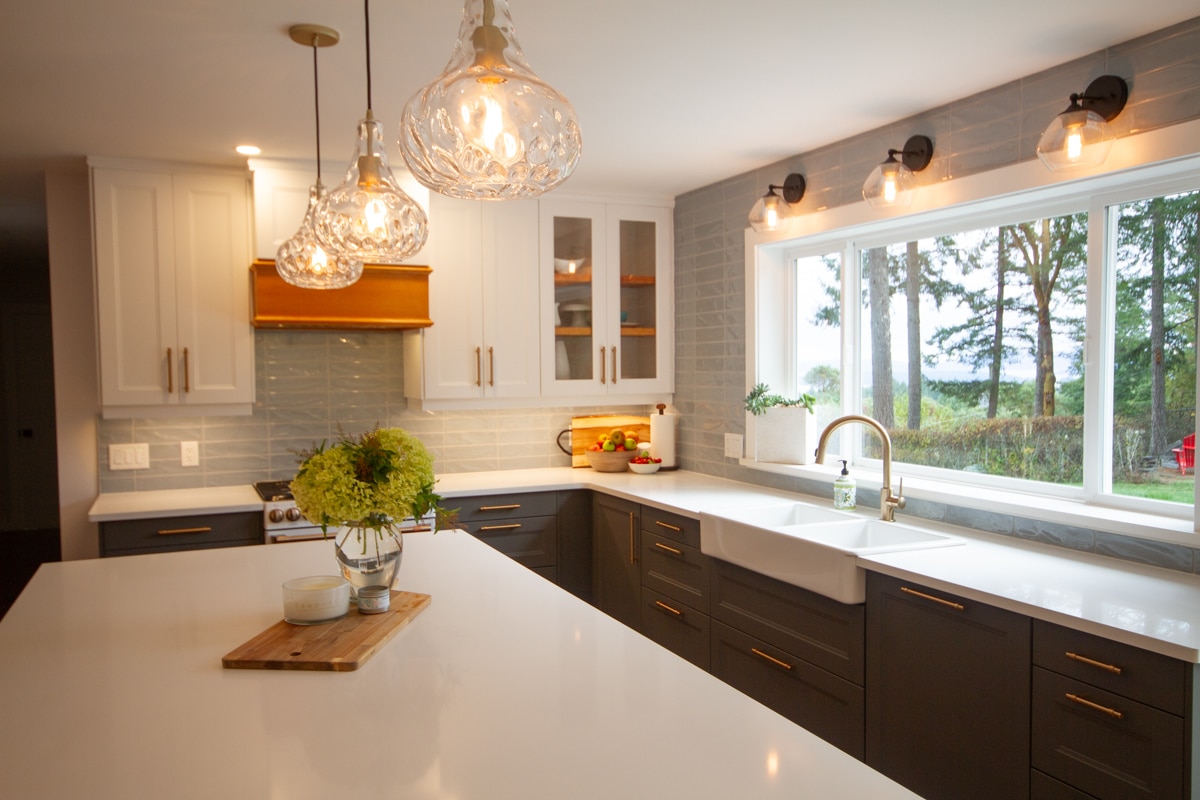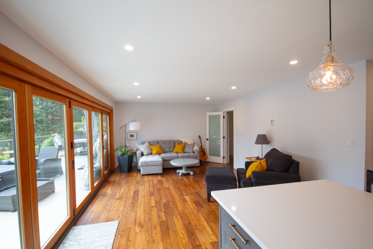 This North Saanich main floor renovation included removing and reframing interior walls to expand the kitchen, add a new hallway, and create a walk-in closet for the primary bedroom. We updated the entire level with new flooring, doors, drywall, paint, custom cabinetry, countertops, and backsplash. A refreshed laundry room with built-in cabinets improved functionality, while a dramatic 24’ curtain door connected the interior to the outdoors. The project was completed with refinished stairs and a handcrafted custom hood fan cover.